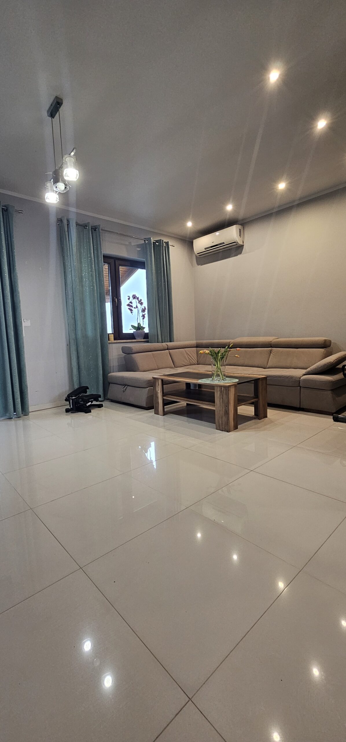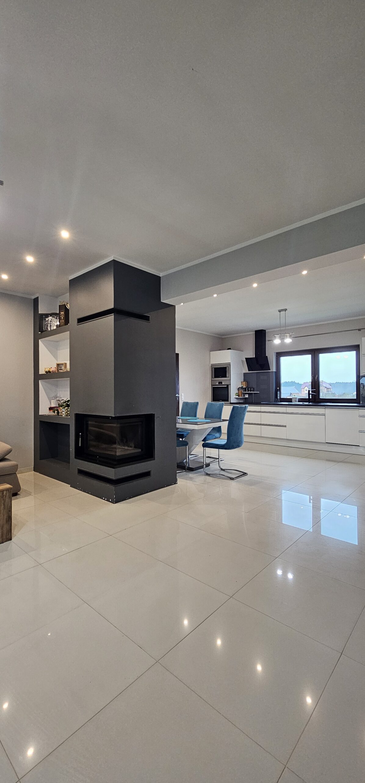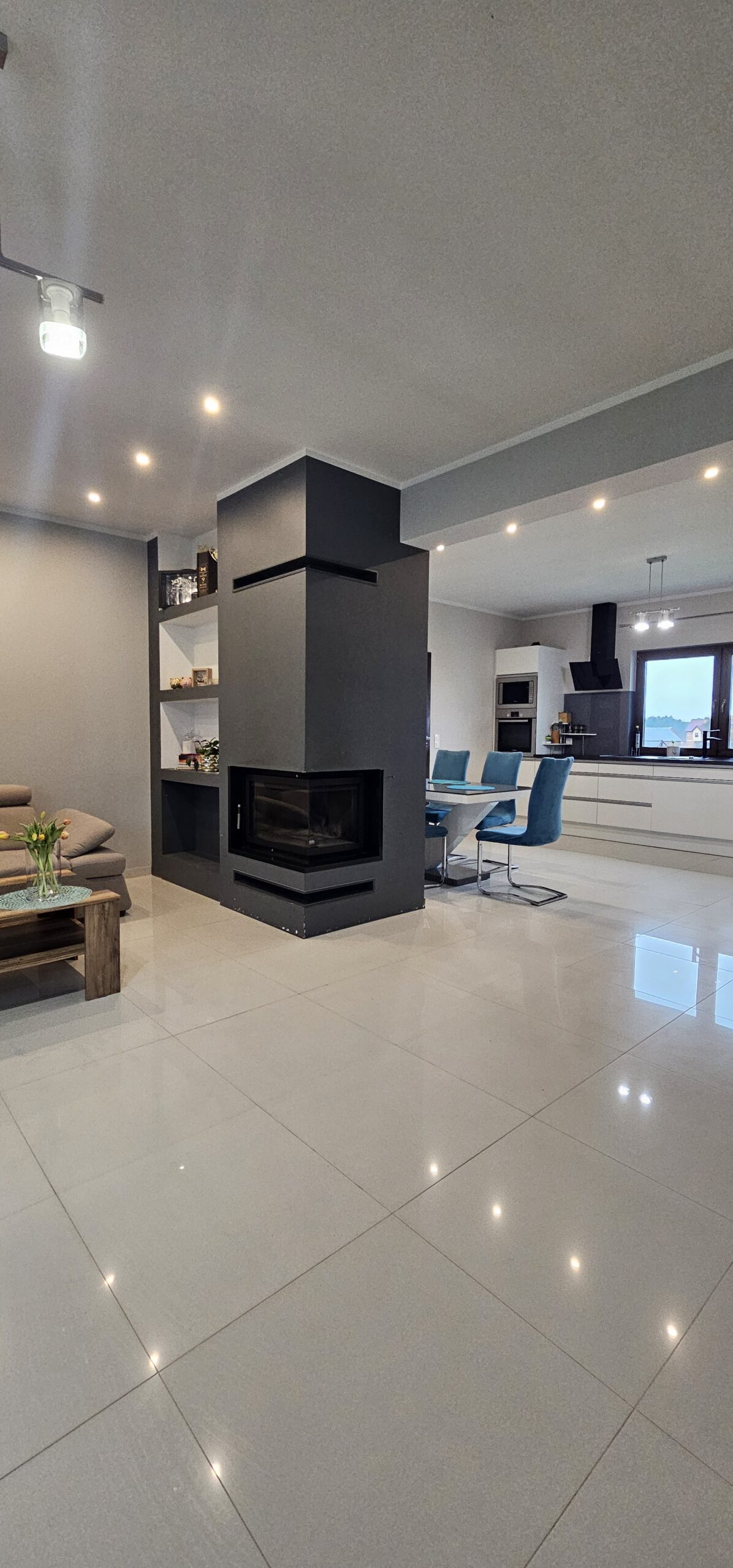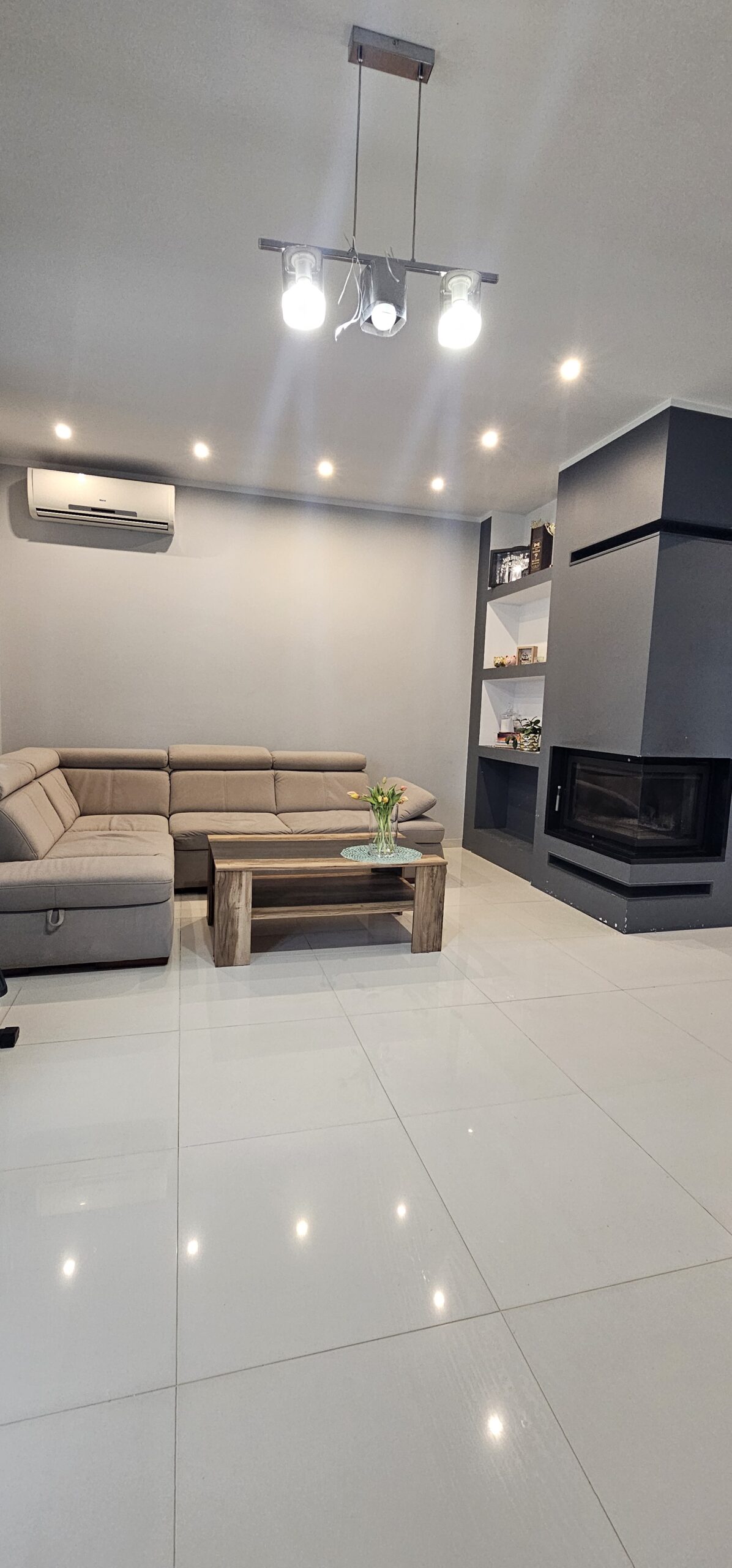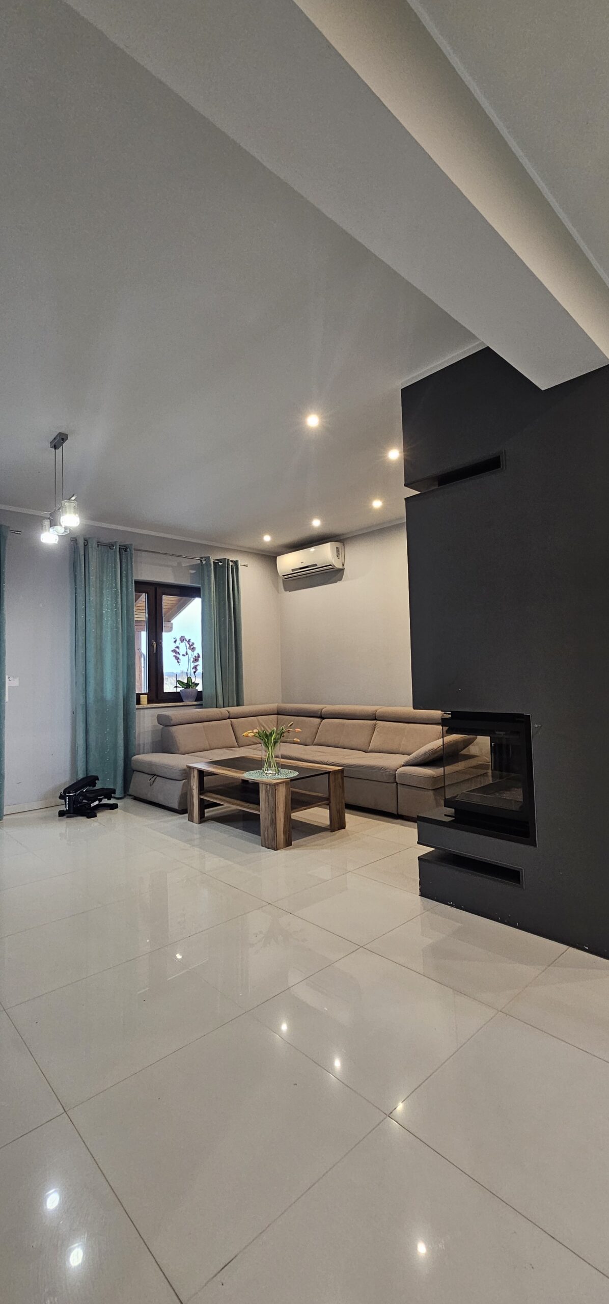W salonie nowoczesny, narożny kominek, klimatyzacja.Dom wybudowany z bloczków Ytong.