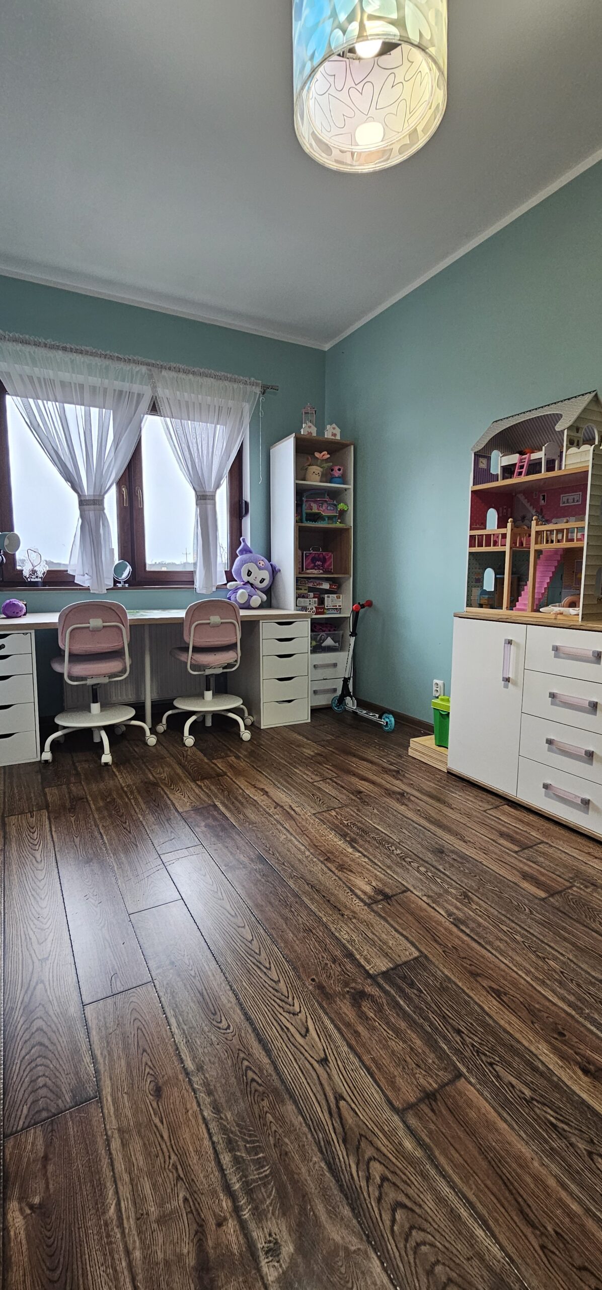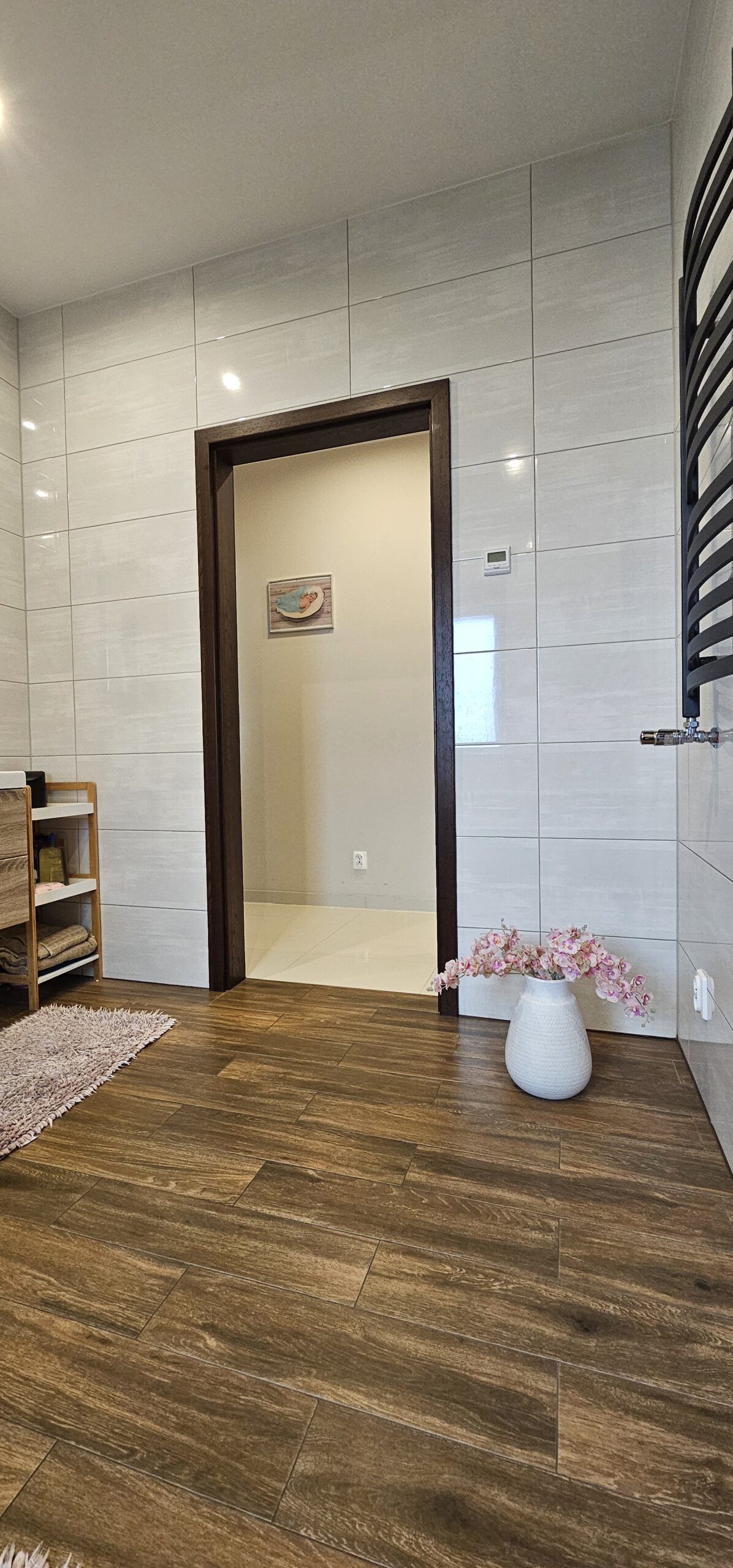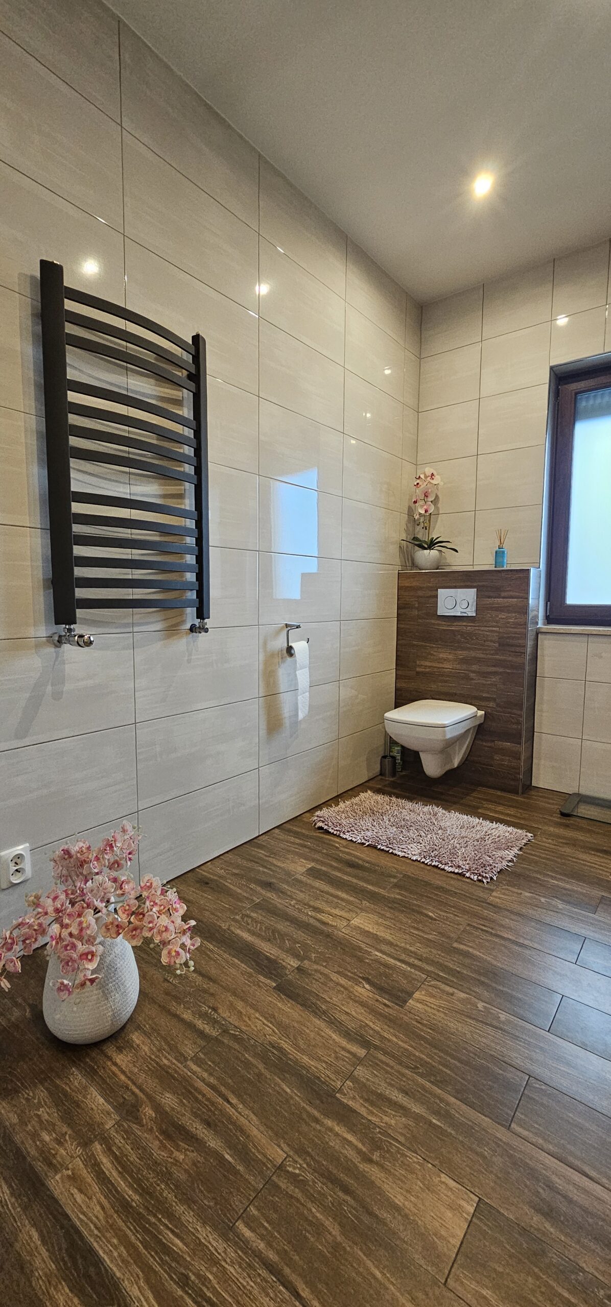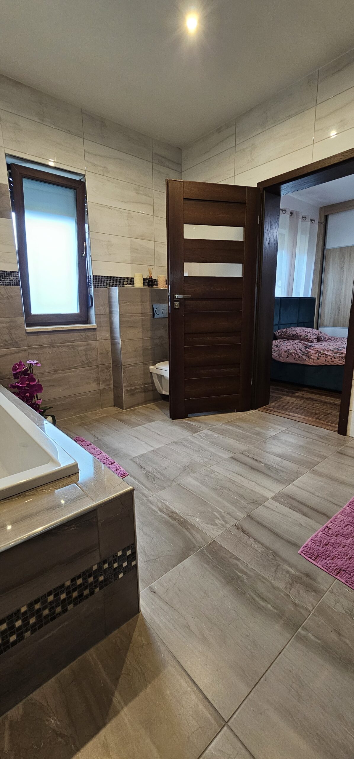 – kotłownia z kotłem na pellet z zasobnikiem, zasilający ogrzewanie podłogowe w salonie ,kuchni i ciągach komunikacyjnych ( sterowniki regulujące temperaturę w każdym pomieszczeniu ) ,grzejniki w sypialniach oraz wodę.
