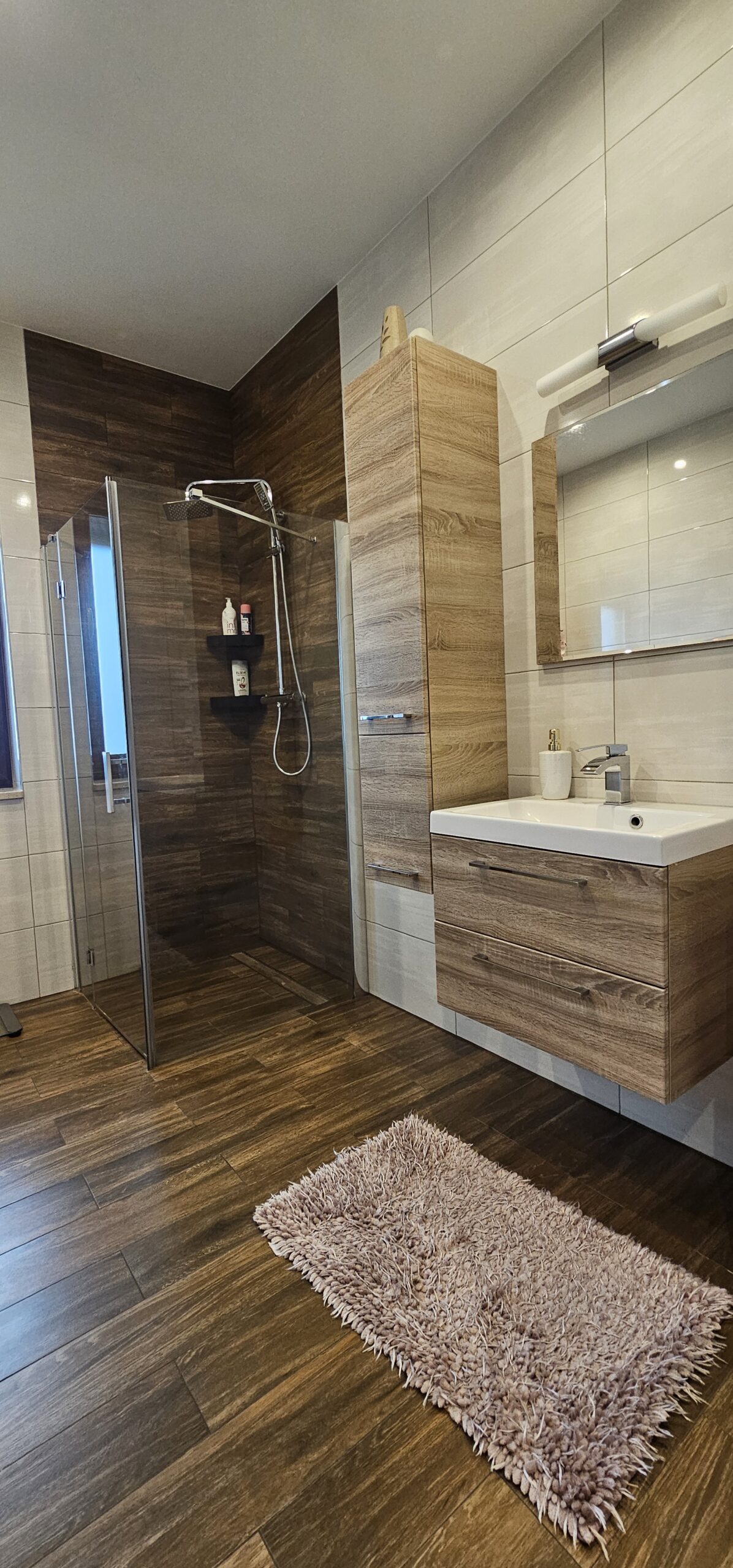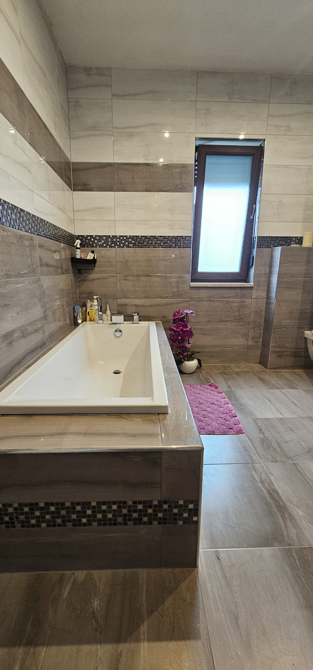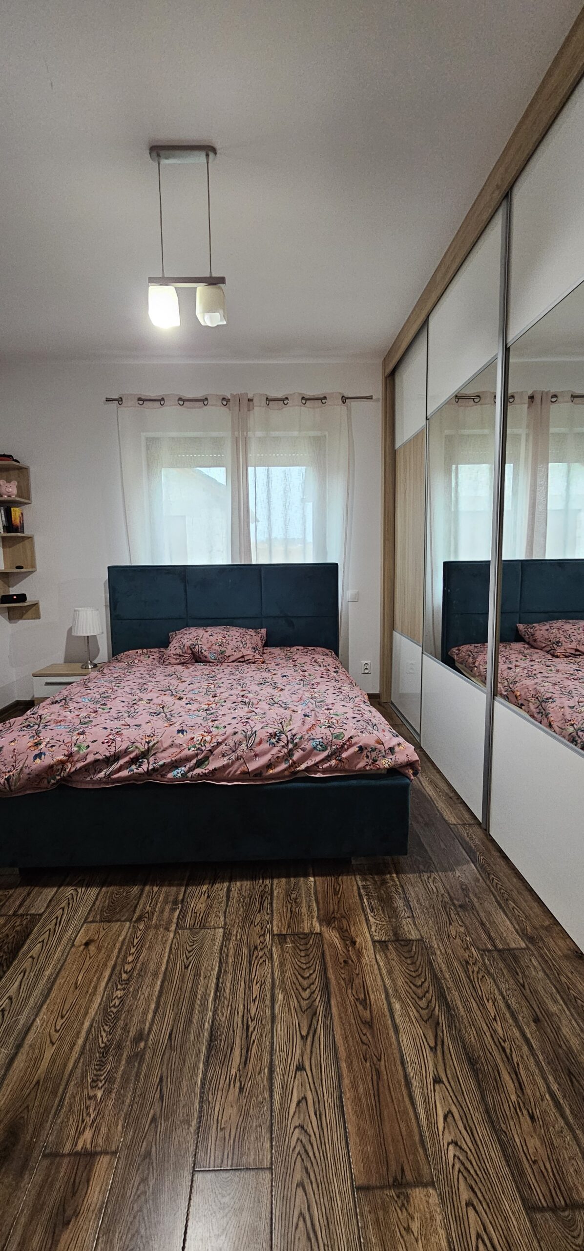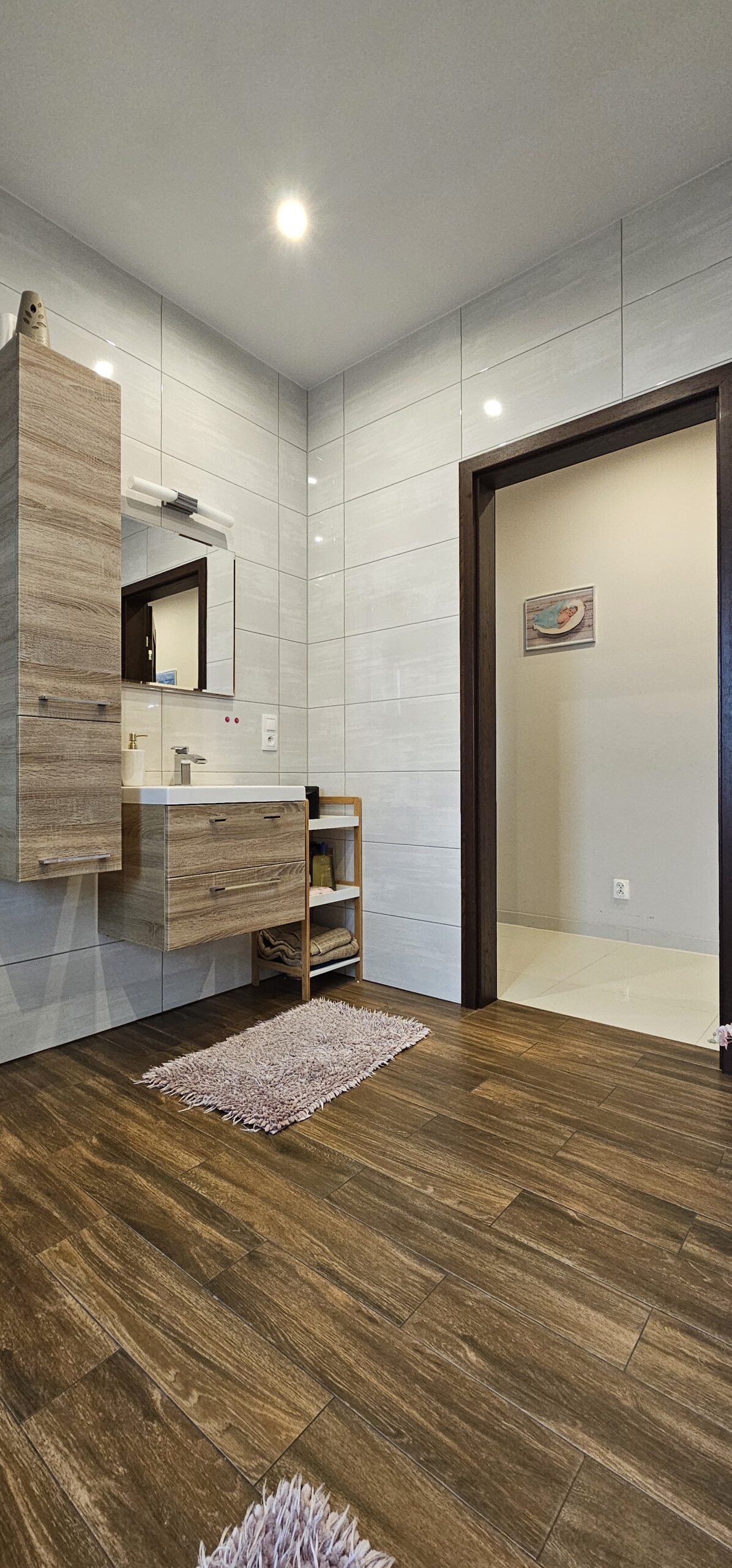– kotłownia z kotłem na pellet z zasobnikiem, zasilający ogrzewanie podłogowe w salonie ,kuchni i ciągach komunikacyjnych ( sterowniki regulujące temperaturę w każdym pomieszczeniu ) ,grzejniki w sypialniach oraz wodę.