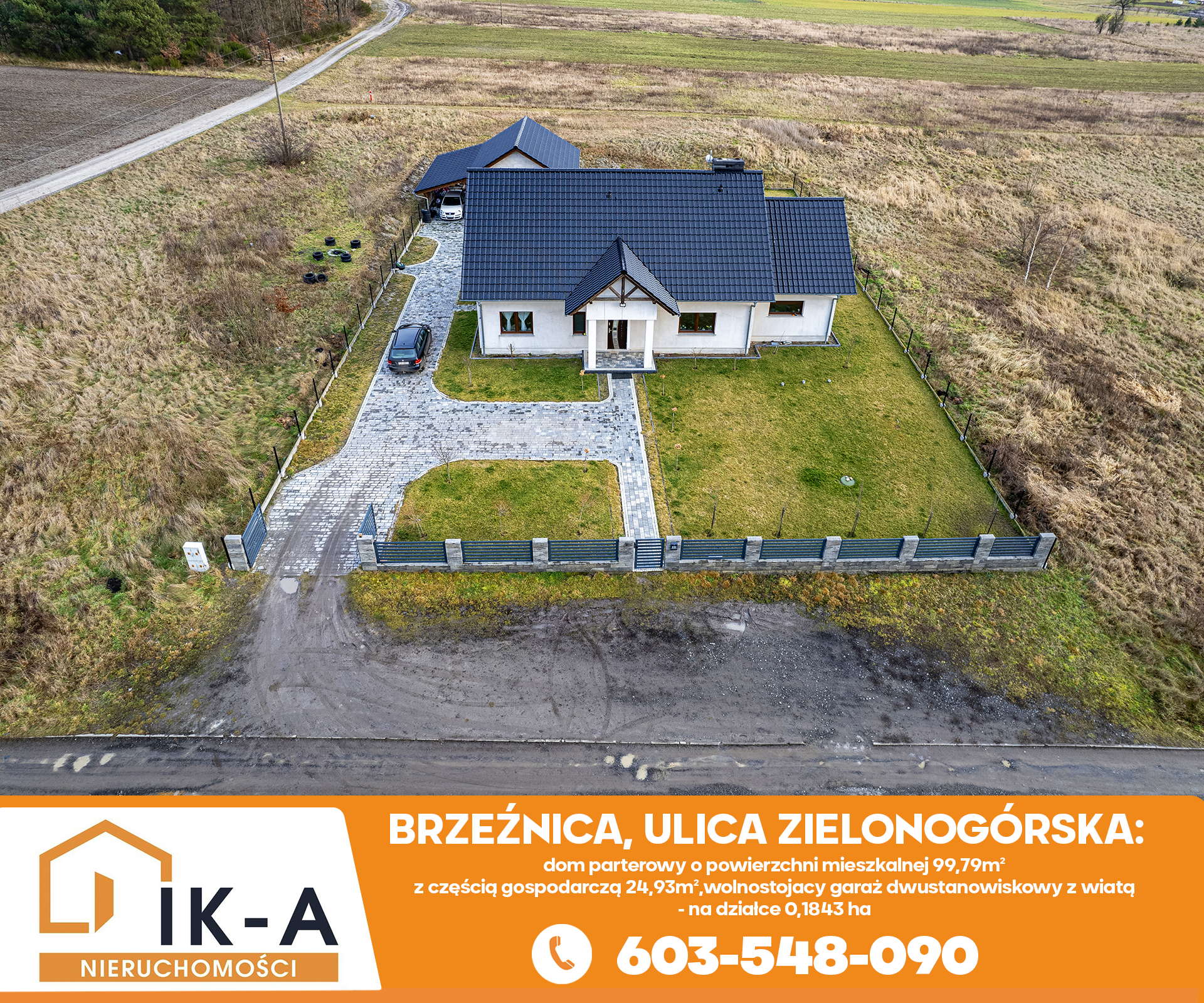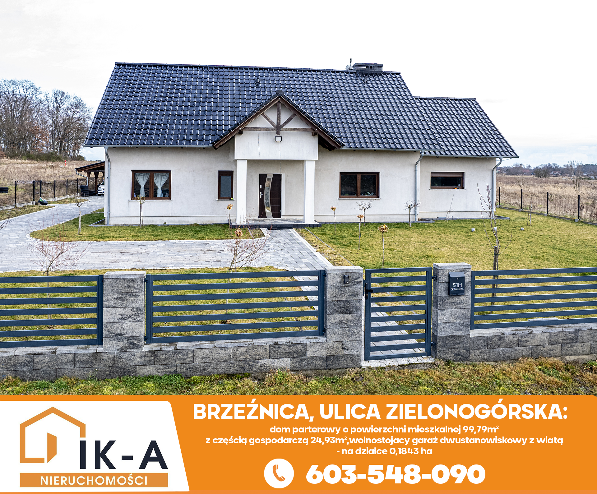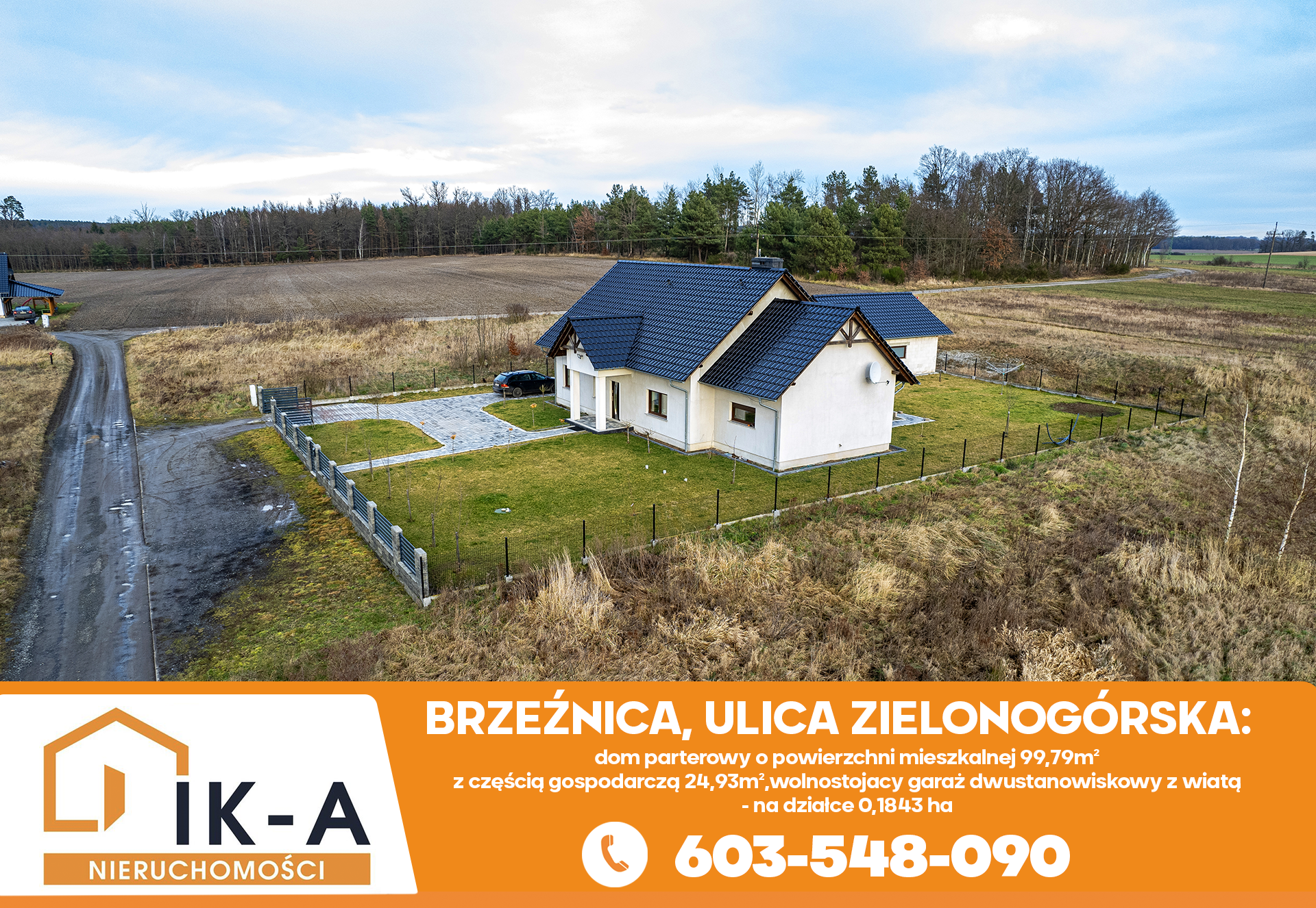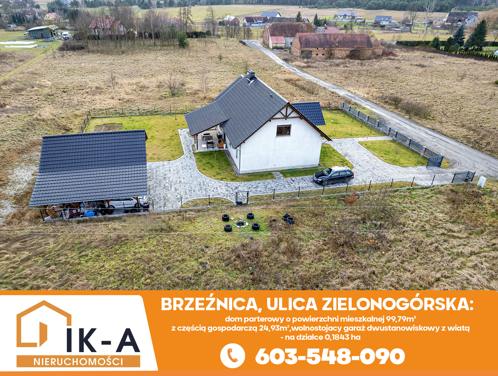 Brzeźnica ulica Zielonogórska, na sprzedaż dom parterowy z 2017r. ,o powierzchni całkowitej 124,72m2 z wolnostojącym garażem dwustanowiskowym z wiatą, na działce o powierzchni 0,1843ha.