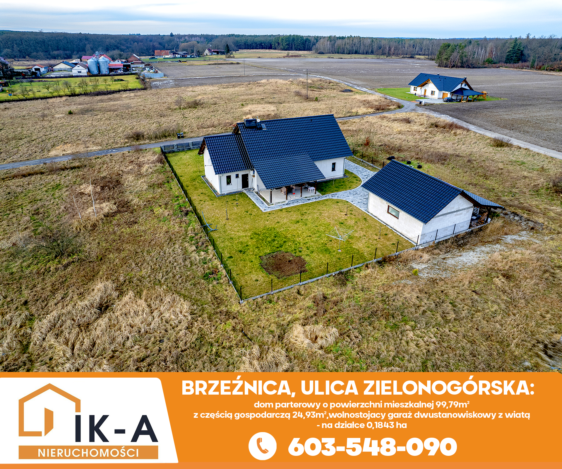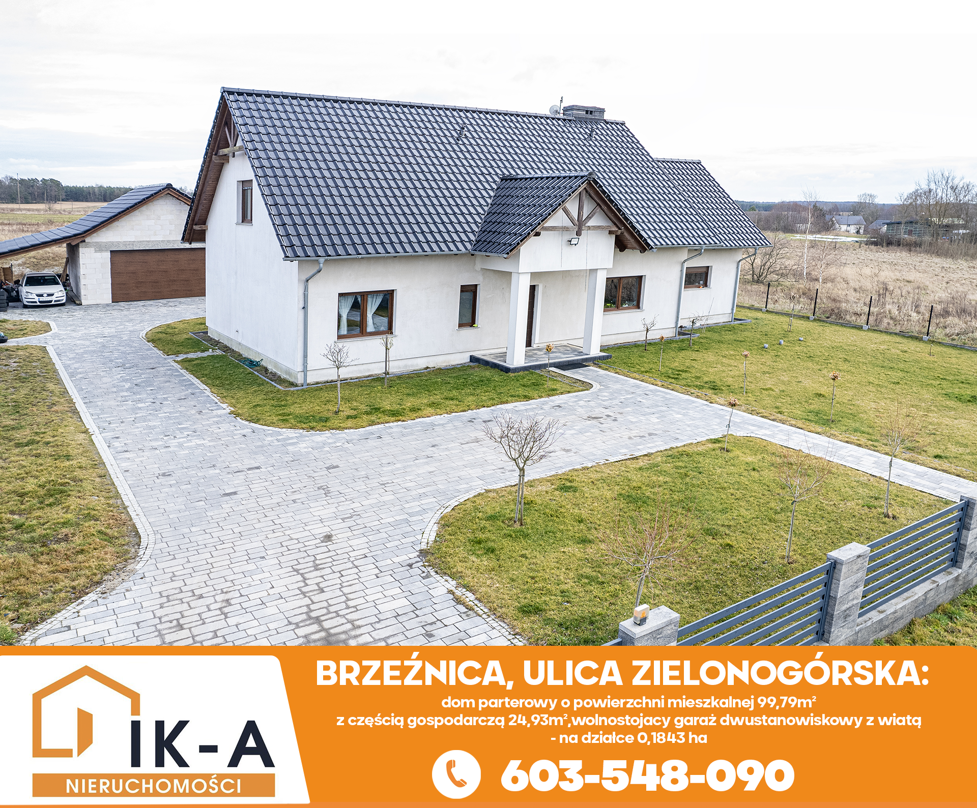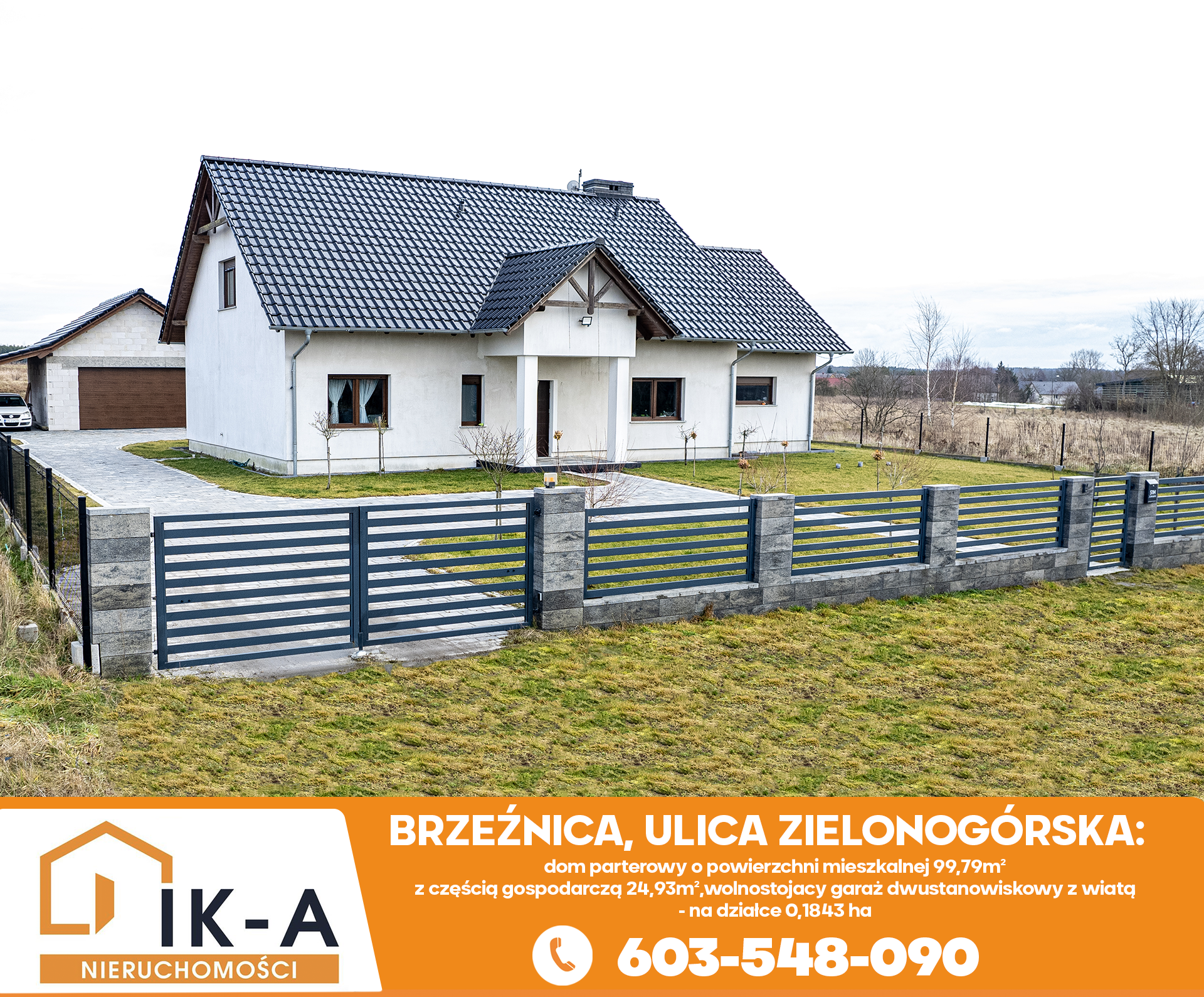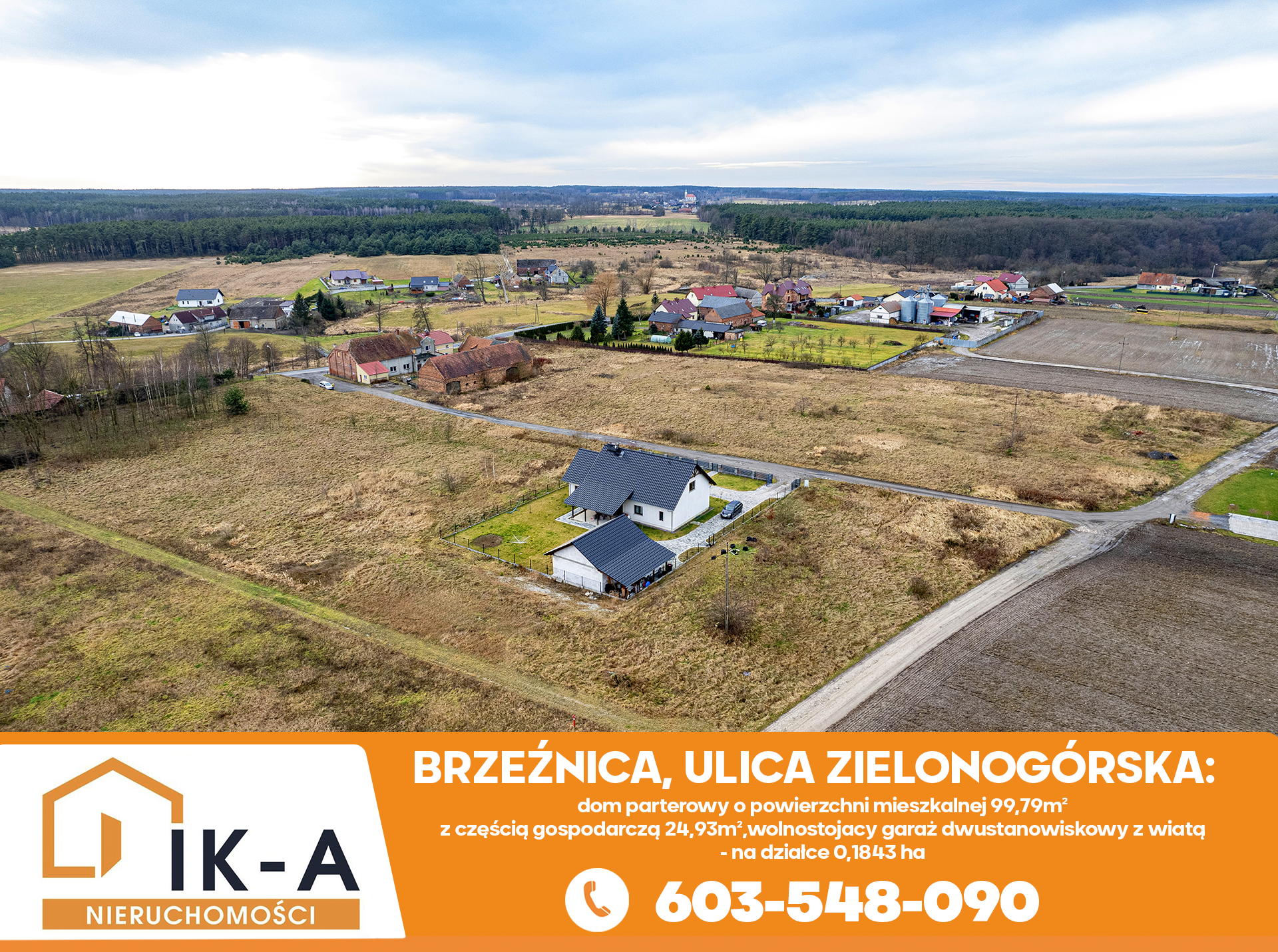 Brzeźnica ulica Zielonogórska, na sprzedaż dom parterowy z 2017r. ,o powierzchni całkowitej 124,72m2 z wolnostojącym garażem dwustanowiskowym z wiatą, na działce o powierzchni 0,1843ha.